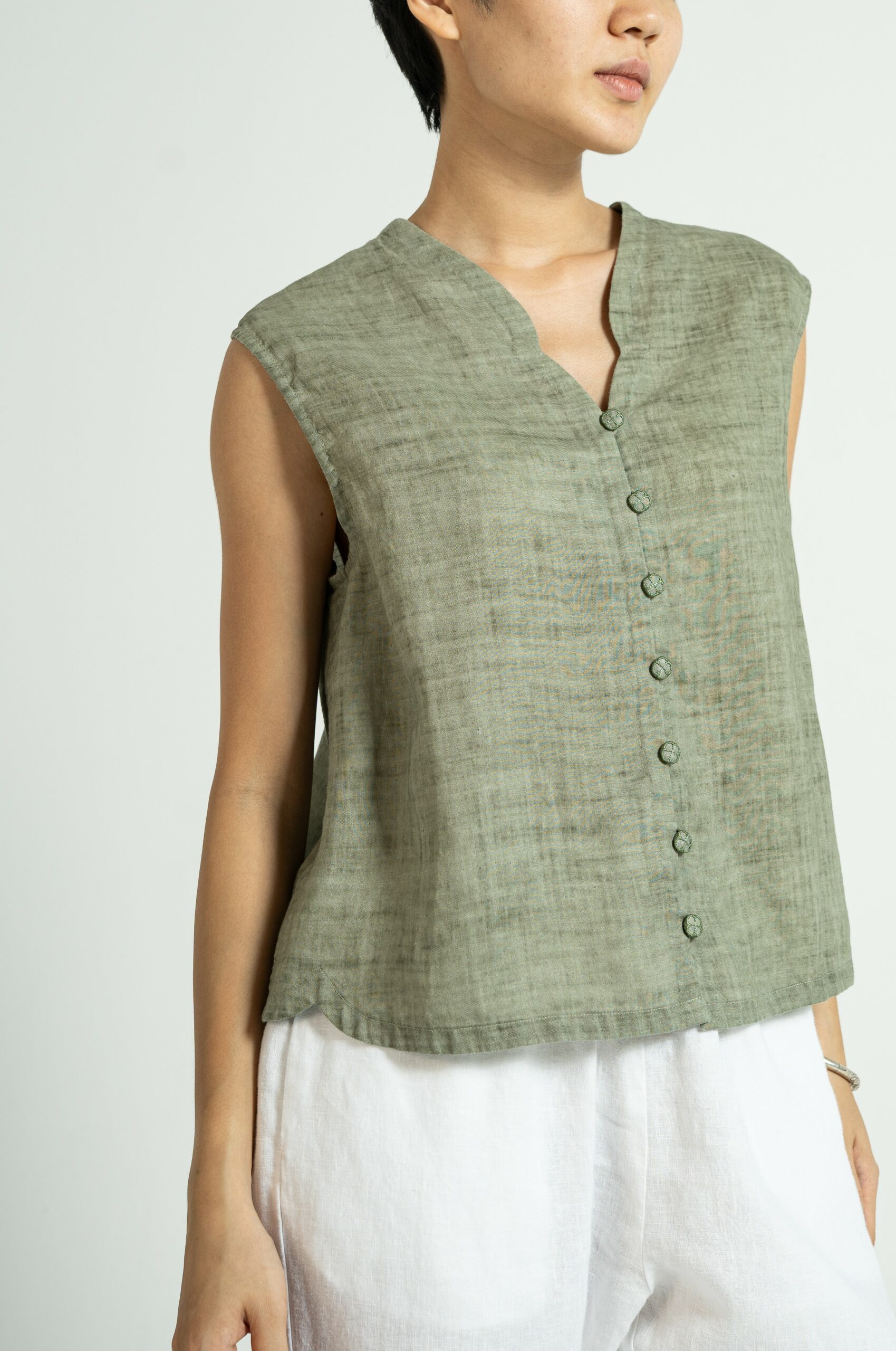 Huong Van Sa | Mud Silk Sleeveless Top with Hand Embroidery Buttons