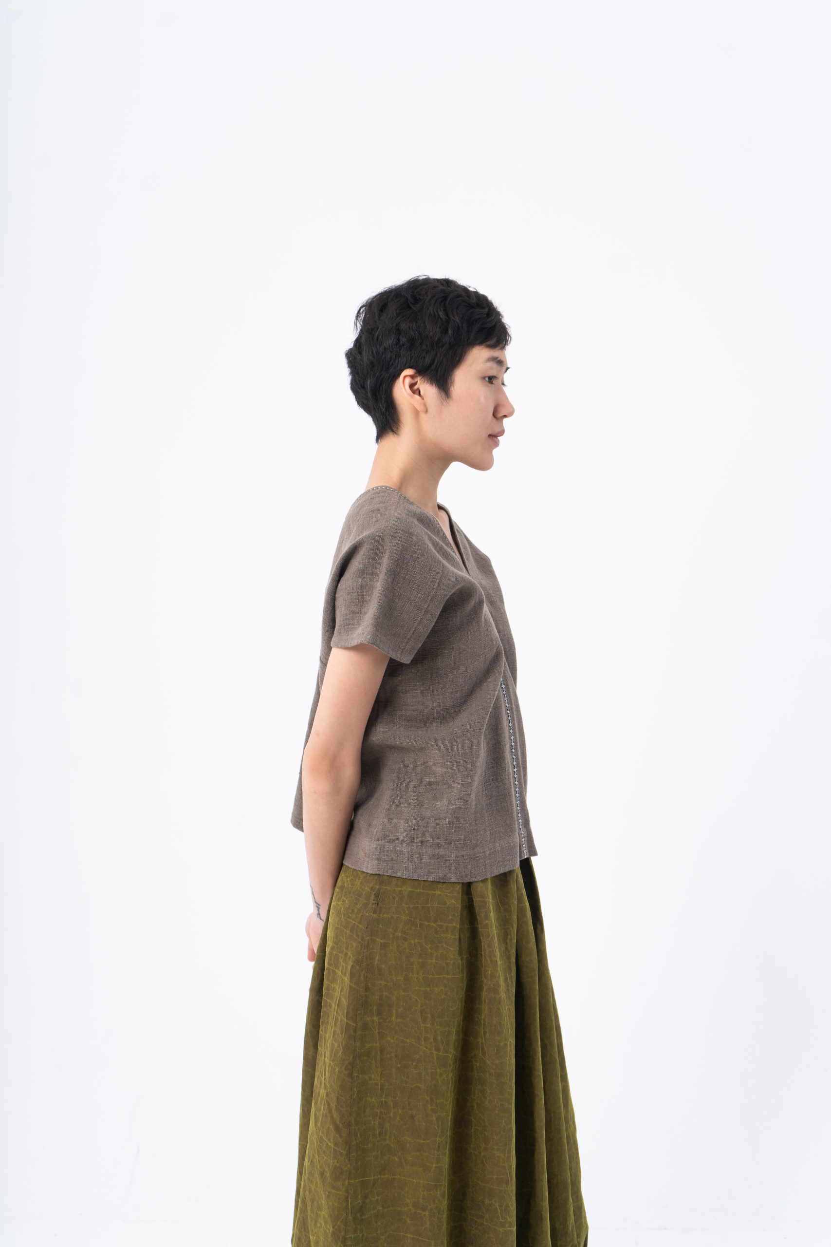 The Silk Duo-Tone Top features two contrasting panels that intersect diagonally across the front. Made from soft, fluid silk with a subtle textured finish, it offers visual depth and sophistication. The relaxed, hip-length silhouette with extended cap sleeves and a V-neckline brings a modern touch while maintaining a minimalist elegance. Perfect worn on its own or paired with a matching silk skirt or trousers for a coordinated look.